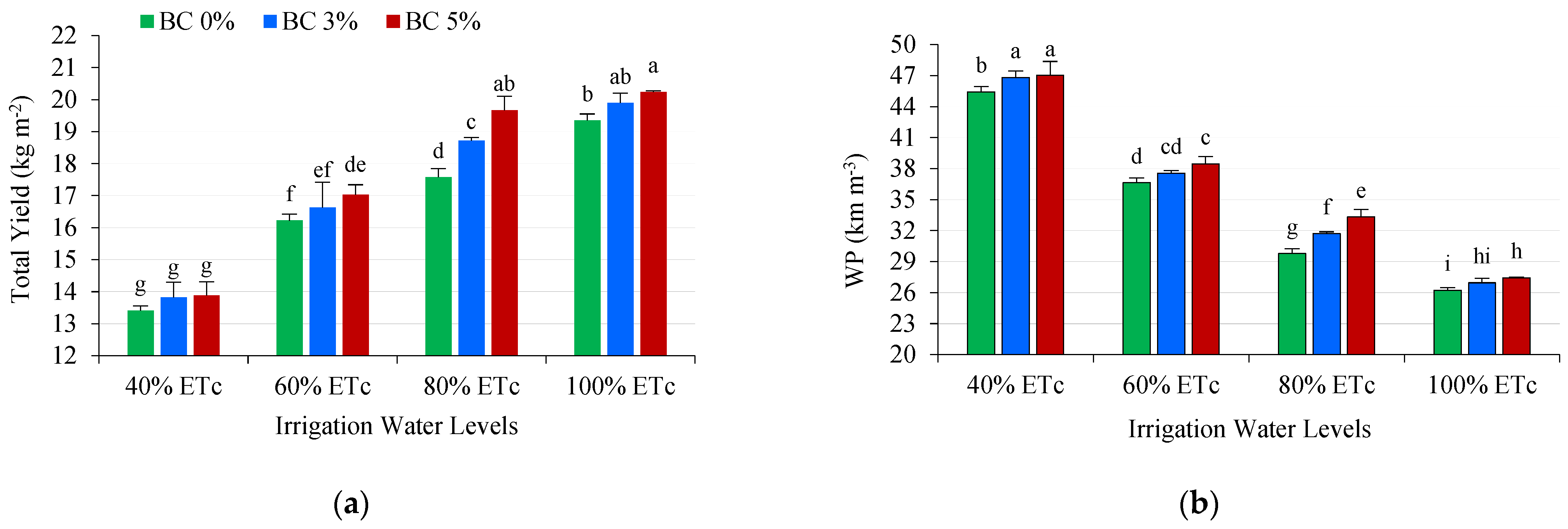 2.4. Effects of Biochar on Total Yield (kg m−2) and WP (kg m−3) of Tomato Plants Grown Under Water Deficit Conditions