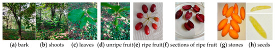 In Figure 1, some suggestive segments of the CM plant (bark, shoots, leaves, fruits, stone, and seeds) are shown.