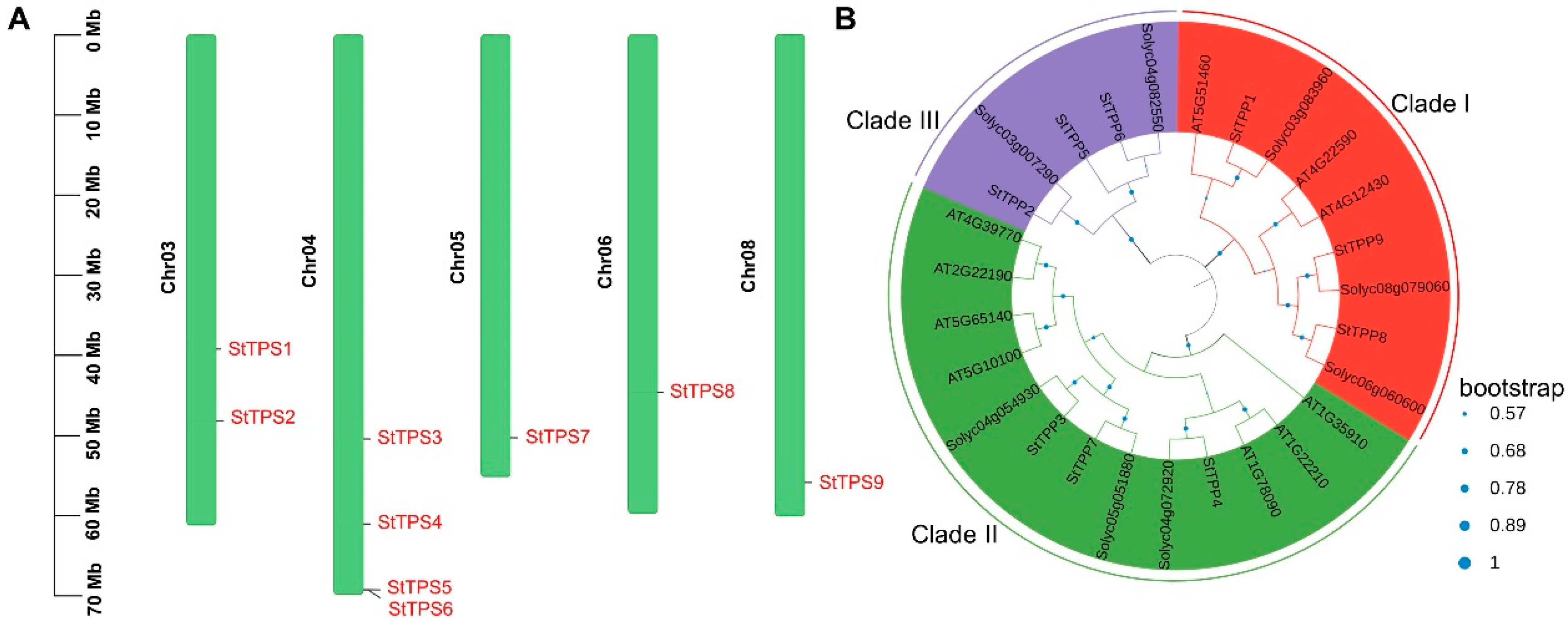 2.2. Chromosomal Distribution and Phylogenetic Analysis of StTPP Genes in Potato