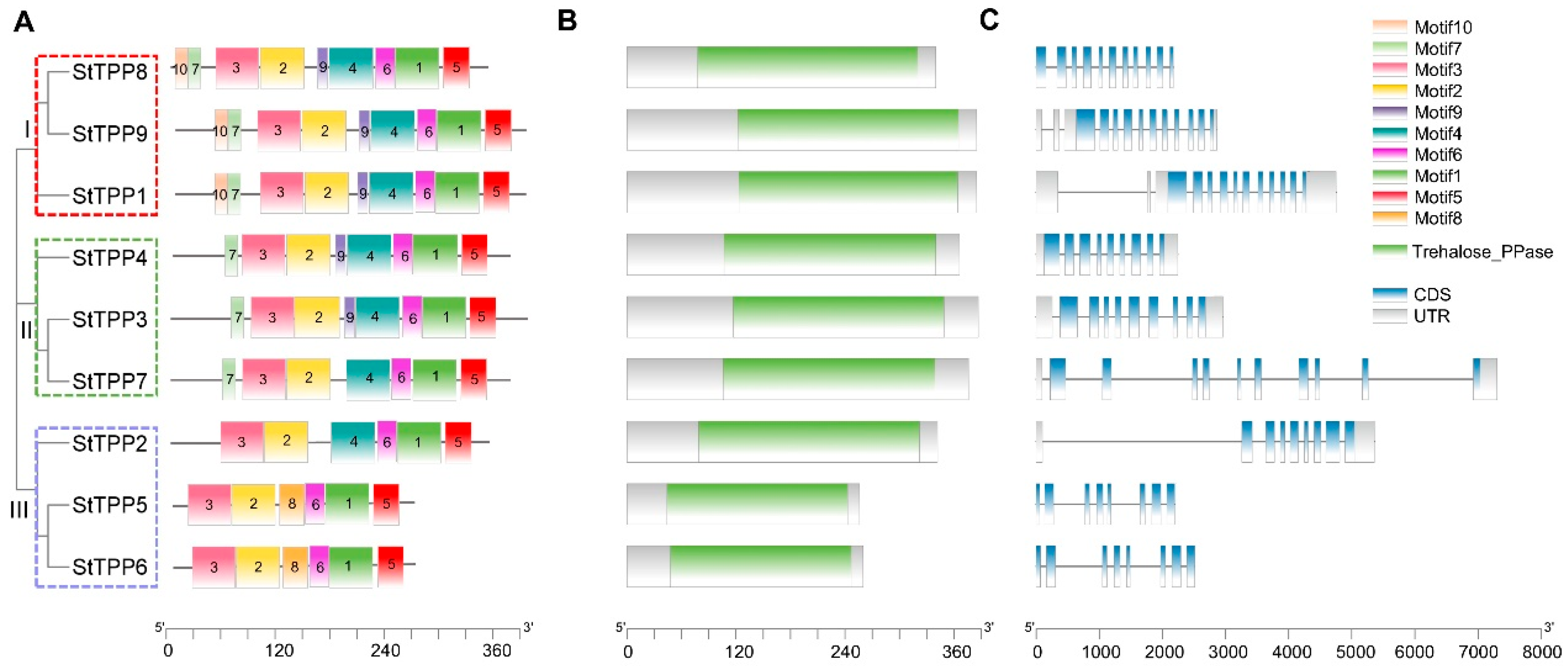 2.3. Conserved Motif, Domain, and Gene Structure Analysis of StTPP