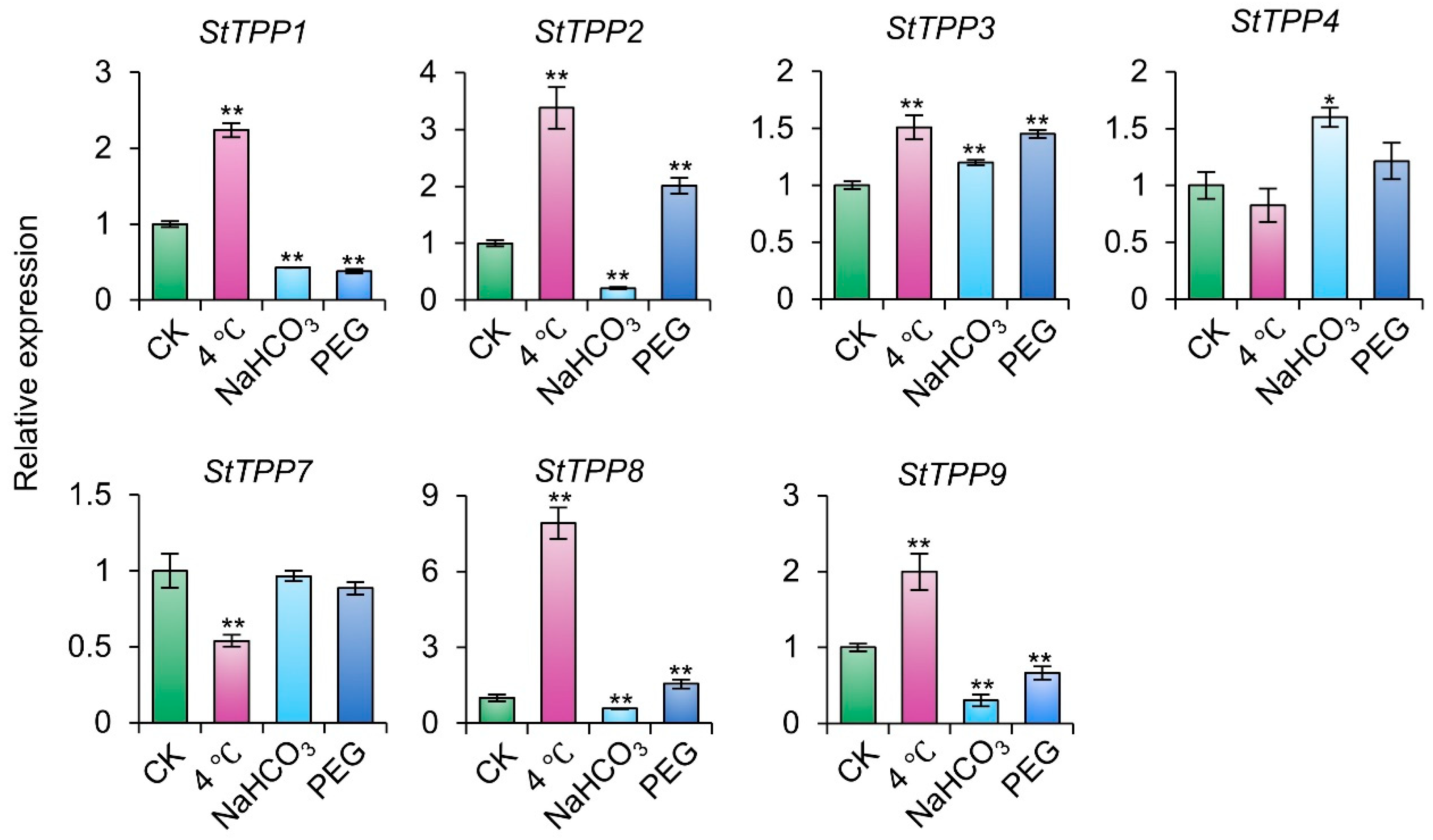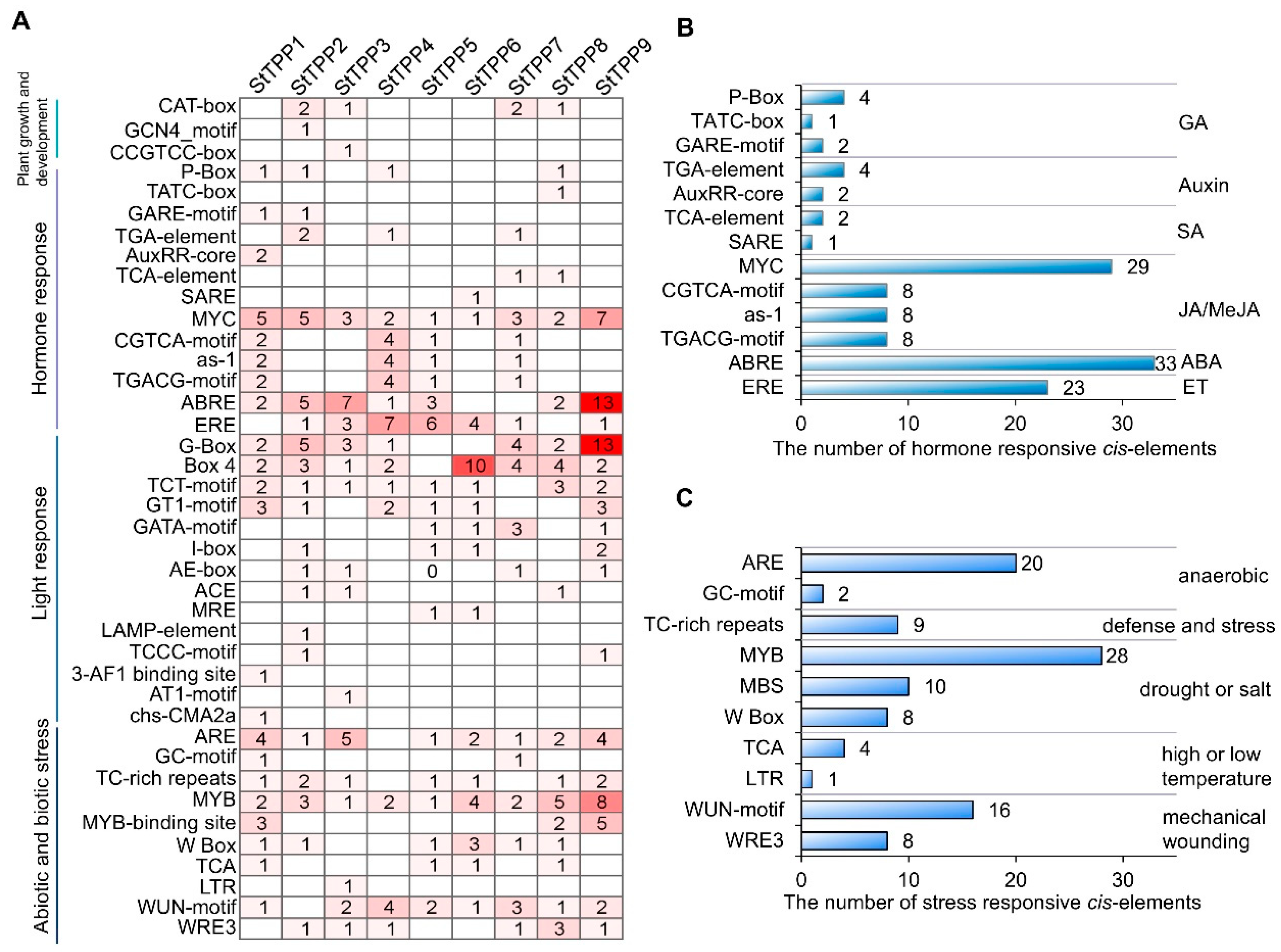 2.5. In Silico Analysis of Cis-Elements in StTPP Promoters