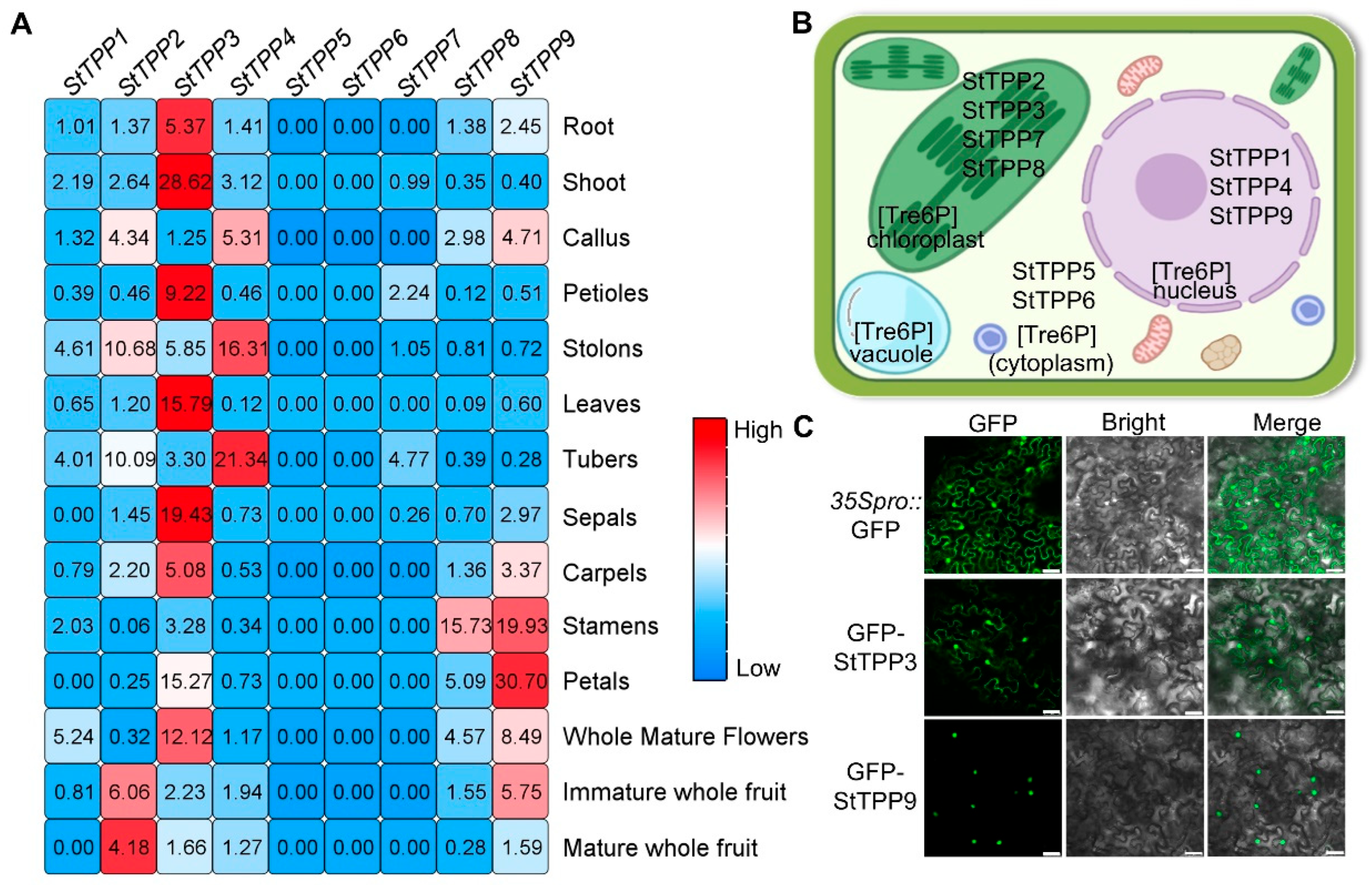 2.7. Tissue-Specific Expression and Subcellular Localization of StTPPs