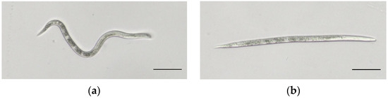 Second-stage juveniles (J2s) of M. enterolobii. Note: (a) Healthy J2. (b) Dead J2 after being treated with E. japonicum rhizome extract. Scale bars = 50 μm.