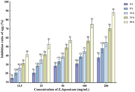 Effects of E. japonicum rhizome extract on the hatching of nematode single egg. Note: Bars marked with different capital letters between different times at the same concentration indicate significant differences (p < 0.05) as tested by Tukey’s method; bars marked with different lowercase letters between different concentrations at the same time indicate significant differences (p < 0.05) as tested by Tukey’s method.