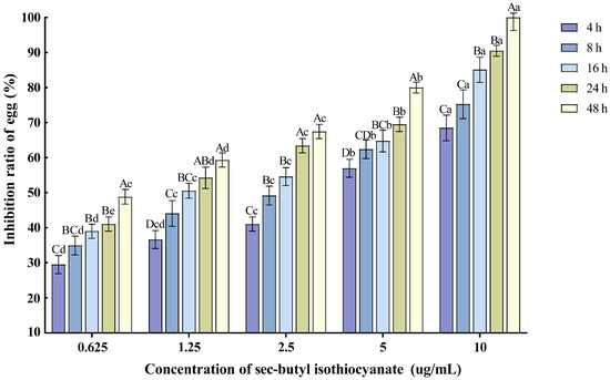 Effects of sec-butyl isothiocyanate on the hatching of nematode single egg. Note: Mean values marked with different capital letters between different times at the same concentration indicate significant differences (p < 0.05) as tested by Tukey’s method; mean values marked with different lowercase letters between different concentrations at the same time indicate significant differences (p < 0.05) as tested by Tukey’s method.