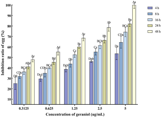 Effects of geraniol on the hatching of nematode single egg. Note: The mean values marked with different capital letters between different times at the same concentration indicate significant differences (p < 0.05) as tested by Tukey’s method; mean values marked with different lowercase letters between different concentrations at the same time indicate significant differences (p < 0.05) as tested by Tukey’s method.
