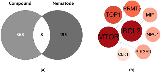 Venn diagram and PPI network of common targets of compounds and nematodes. Note: (a) Venn diagram: Light gray and dark gray represent the compound targets and nematode targets, respectively. The overlapping area indicates the common protein targets. (b) PPI network: Circular nodes with different colors and sizes represent various proteins; the lines between nodes denote the interaction relationships among these proteins.
