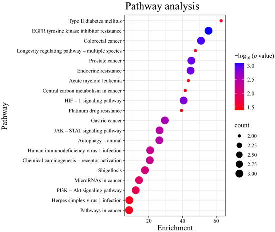 Gene Ontology (GO) analysis was performed on the targets in the PPI network using DAVID. The results indicated that the numbers of terms related to cellular component (CC), molecular function (MF), and biological process (BP) were 26, 18, and 24, respectively (p < 0.05). Based on the p value, the top three CCs were the nucleus, endoplasmic reticulum, and nuclear envelope, which are highly correlated with the cell nucleus and cytoplasm. The top three MFs were protein serine/threonine kinase activity, identical protein binding, protease binding, and protein tyrosine kinase activity. The top three BPs were chromatin remodeling, response to xenobiotic stimulus, and negative regulation of myeloid cell apoptotic process, which are closely related to the defensive response (Figure 6). After Kyoto Encyclopedia of Genes and Genomes (KEGG) signaling pathway analysis, a total of 20 signaling pathways were obtained (p < 0.05). The top five signaling pathways were pathways in cancer, herpes simplex virus 1 infection, PI3K-Akt signaling pathway, microRNAs in cancer, and shigellosis (Figure 7).