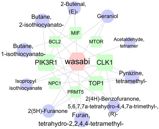 The network of compound–target protein interaction. Note: Circles represent wasabi compounds, squares represent targets, and hexagons represent wasabi. Nodes are connected by lines, with shorter distances indicating closer interaction relationships.