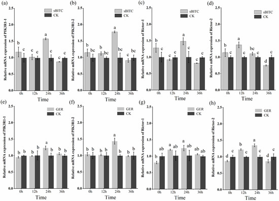 Analysis of gene expression patterns. Note: (a–d) Expression patterns of PIK3R1 and Rictor genes in second-stage juveniles (J2s) after treatment with 1.25 μg/mL sec-butyl isothiocyanate (sBITC). (e–h) Expression levels of PIK3R1 and Rictor genes in second-stage juveniles (J2s) after treatment with 1.25 μg/mL geraniol (GER). Columns marked with the different letters indicate significant differences (p < 0.05) as tested by Tukey’s method.