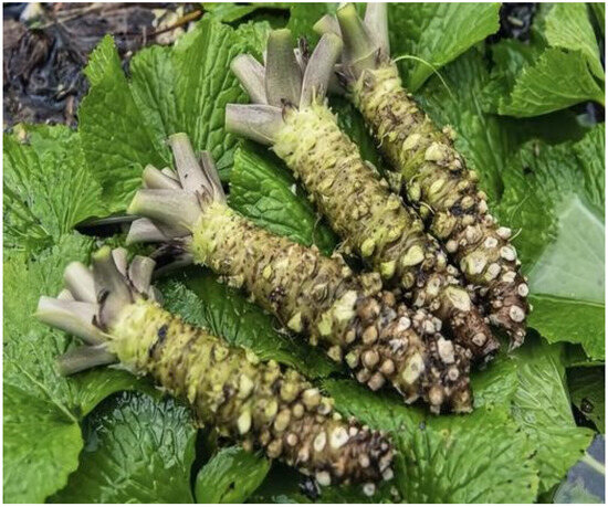 - Hara, M.; Mochizuki, K.; Kaneko, S.; Iiyama, T.; INA, T.; ETOH, H.; KUBOI, T. Changes in pungent components of two Wasabia japonica Matsum. cultivars during the cultivation period. Food Sci. Technol. Res. 2003, 9, 288–291. [Google Scholar] [CrossRef]