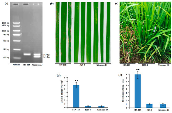 Detection of molecular markers in improved lines and phenotype of blast resistance. (a) The results of Pigm-1 molecular marker detection showed that Xiannuo 23 contained Pigm-1 that had two expected bands of 163 bp and 131 bp, while S19-118 without Pigm-1 had only one band of 163 bp. (b) The greenhouse test results of the improved lines showed that S19-118 was susceptible to rice blast, while R20-4 and Xiannuo 23 were resistant to rice blast. (c) The field test results of the improved line showed that S19-118 was susceptible to, but R20-4 and Xiannuo 23 were resistant to, the rice blast variant Guy 11. (d) Lesion numbers per cm2 on the rice leaves (M ± SD, n > 10 leaves) in (b). (e) The incidence scores of the strains are based on the results in (c), the disease score of S19-118 is 9, while both R20-4 and Xiannuo 23 have a score of 1. Asterisks (**) indicate statistical significance (p < 0.01) determined by Student’s t test.