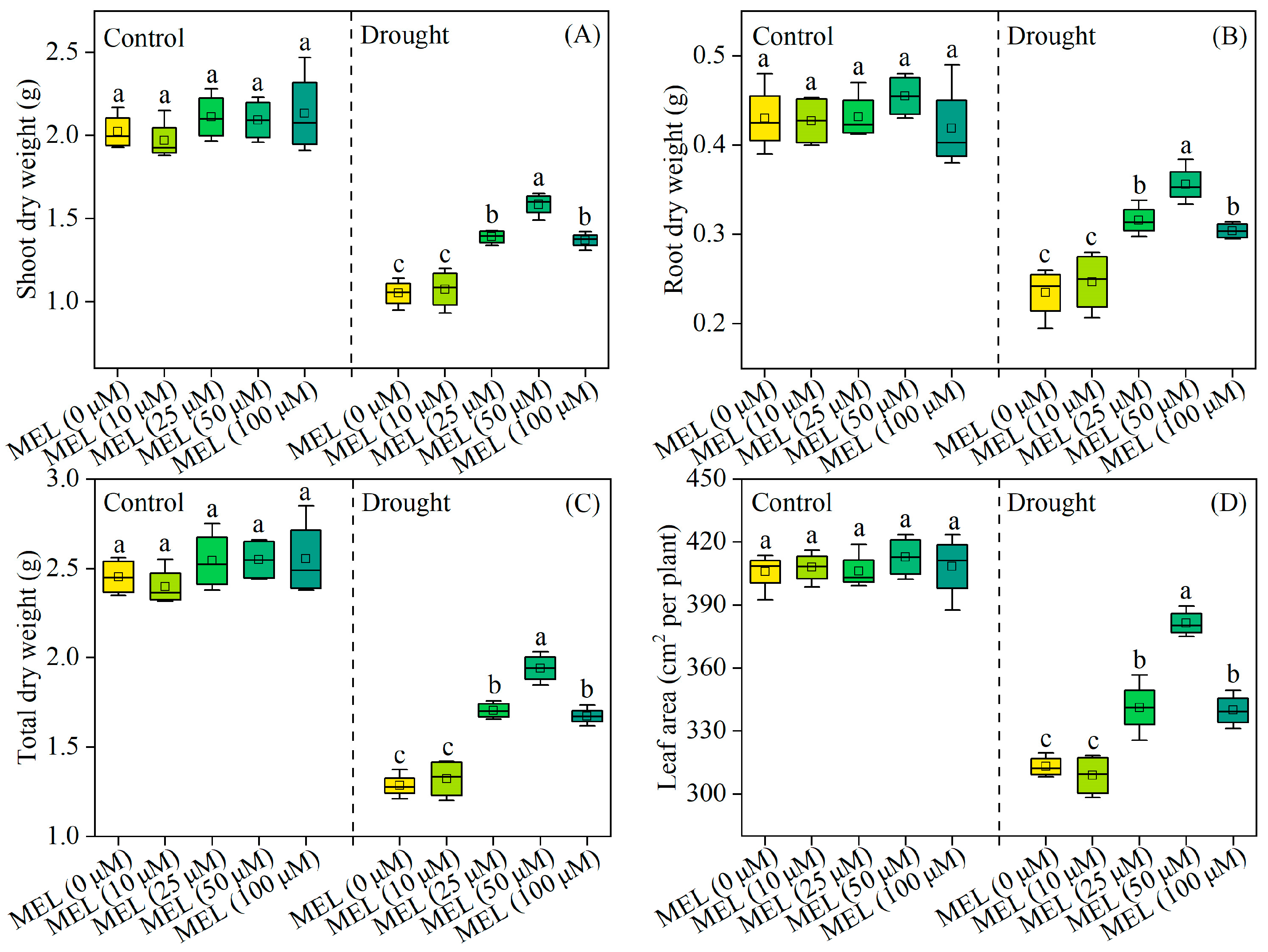 2.1. Melatonin Promoted Plant Growth Under Drought Stress