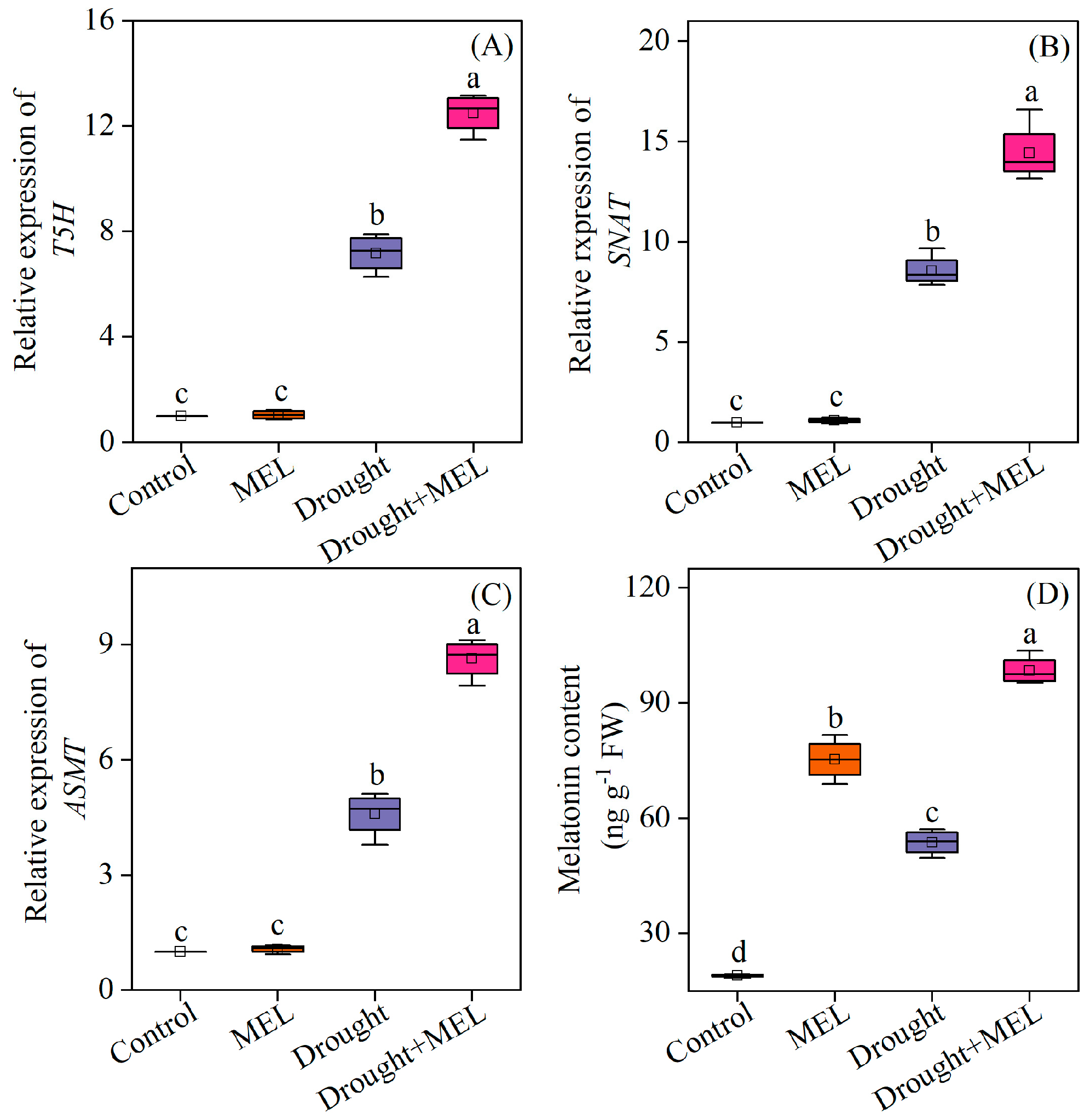 2.2. Effects of Drought and Melatonin Treatment on Endogenous Melatonin Contents