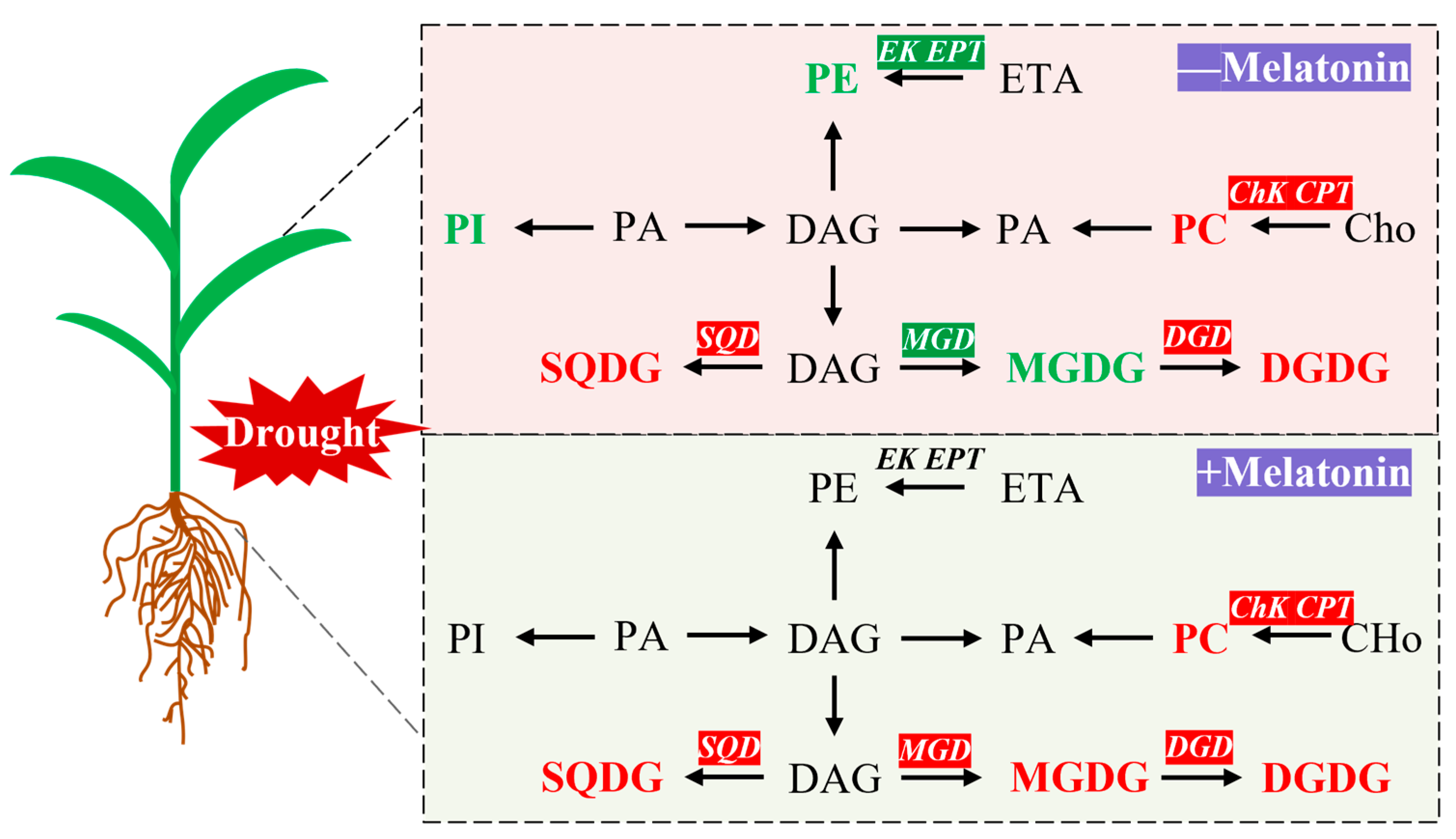 - Wang, Y.; Zhou, W.; Wang, Z.; Gao, S.; Zhang, R. Integrated metabolome, transcriptome and physiological analyses of melatonin-induced drought responses in maize roots and leaves. Plant Growth Regul. 2025, 105, 229–244. [Google Scholar] [CrossRef]
