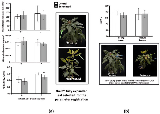 Impact of exogenous Zn2+ (300 μmol/L) on stomatal conductivity, chlorophyll content, photosystem II (PS II) activity (a), and leaf relative water content (b) of the third mature leaf (the leaf is indicated by green arrows at photos in the insert; numeration of the mature leaves were performed just beneath the plant top with young (i.e., not fully expanded) leaves) from six-week-old (before Zn2+-exposure, 0 day) and seven-week-old A.caudatus plants (n = 9) (after Zn2+-exposure, 7 day) grown in hydroponic nutrient solution. Gray columns indicate the Zn-treated group, namely plants whose physiological parameters were measured prior (0 day) and after the Zn-stress exposure (7 day). The Zn-stress exposure of the plants was performed by supplementation of 300 μmol/L ZnSO4 in hydroponic nutrient solution for one week. White columns indicate the control group of plants which were grown during the whole experimental period (from 0 to 7 days) in hydroponic nutrient solution without the addition of 300 μmol/L ZnSO4. Fv/Fm—variable fluorescence (Fv)/maximal fluorescence (Fm). Asterisks ** indicate significant difference between Zn-treated and control groups per time point at p (t-test) < 0.01. The experimental data obtained for a leaf of each plant are presented in Osmolovskaya et al. [27] Supplementary Information 2, Tables S2-1–S2-3).