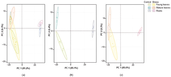 Principal component analysis with a scores plot performed for all treatment groups (roots, young, and mature leaves) with or without stress application (a), all groups of plants grown without Zn treatment (b), and all groups of plants grown under Zn stress conditions (c). PC—principal component; Control—plants grown without Zn treatment; Stress—plants grown under Zn stress (supplementation of 300 μmol/L Zn2+ to the hydroponic solution for 7 days).