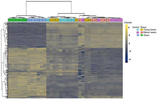 Hierarchical clustering with a heatmap representation showing expression patterns of individual samples performed for all the treatment groups (roots, young, and mature leaves) with or without stress application. Control—plants grown without Zn treatment; stress—plants grown under Zn stress (supplementation of 300 μmol/L Zn2+ to the hydroponic solution for 7 days). Figures indicate individual samples (n = 6) in each experimental group.