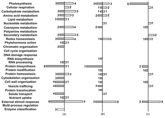 Functional annotation of the proteins identified as differentially expressed in the roots (a), young (b), and mature leaves (c) upon the exposure of the A. caudatus plants to 300 μmol/L Zn2+ supplemented to the hydroponic solution for 7 days (Zn stress) in comparison to the untreated controls. The bar labels indicate the numbers of proteins identified as up- (white) and down- (gray) regulated upon exposure to Zn stress. Protein annotation relied on Mercator MapMan (v4.5) software. Individual proteins comprising each functional class are listed in Supplementary Information 5.