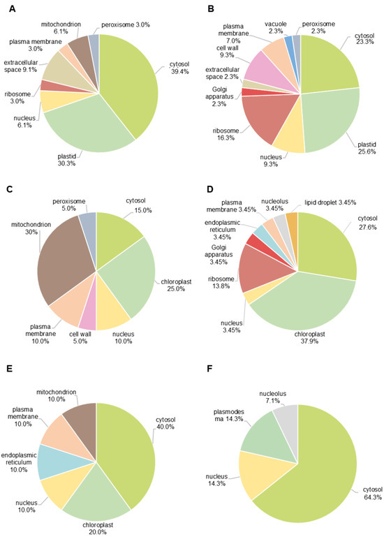 Prediction of sub-cellular localization of the differentially expressed proteins identified as up- (A,C,E) and down-regulated (B,D,F) in amaranth roots (A,B), young (C,D) and mature (E,F) leaves relied on BUSCA software. Individual proteins referred to each compartment are listed in Supplementary Information 6.