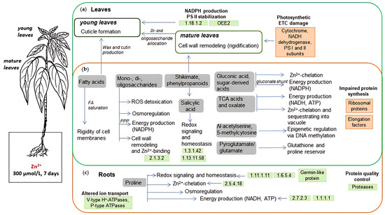 Therefore, here we employ LC-MS-based bottom-up proteomics to address the metabolic responses of the A. caudatus root and leaves to moderate Zn stress. Thereby, we aimed to identify the Zn-responsive proteins in the roots, young and mature leaves of the A. caudatus plants exposed to Zn stress for seven days, as well as their comprehensive discussion in the context of the Zn2+-induced adaptive metabolic shifts discovered in these organs earlier [27].
