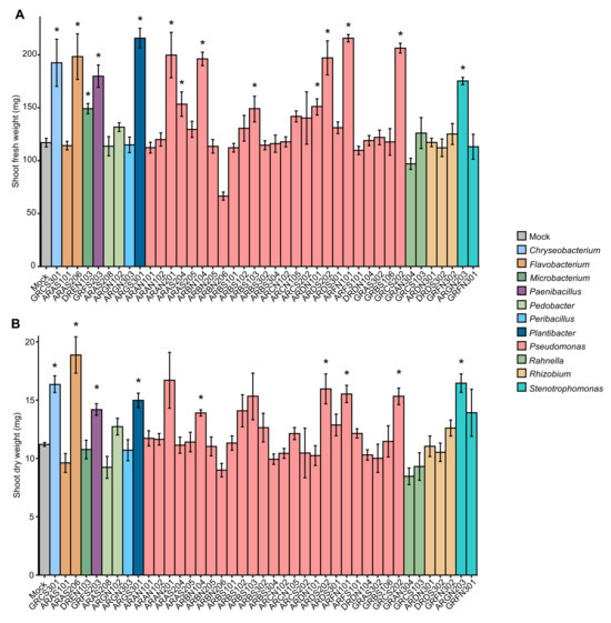 Screening trials of plant growth-promoting bacteria. Tomato plants were treated with MgSO4 (mock-inoculated) or inoculated with a bacterial suspension (bacterium-inoculated) of cold-tolerant bacterial isolates specified by the codes and taxonomic annotations (colored legend). Shoot fresh weight (A) and shoot dry weight (B) were assessed after 28 days of incubation in the growth chamber at 25 ± 2 °C and expressed as mg of each plant. Mean and standard error values of four replicates (pool of four plants) are reported for each inoculation condition. Asterisks indicate significant increases in shoot fresh weight or shoot dry weight in bacterium-inoculated compared to mock-inoculated plants, according to the Mann–Whitney test (p ≤ 0.05).