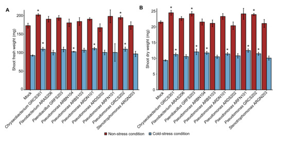 Validation trials of plant growth-promoting bacteria under non-stress and cold-stress conditions. Tomato plants were treated with MgSO4 (mock-inoculated) or inoculated with a bacterial suspension (bacterium-inoculated) of cold-tolerant bacterial isolates specified by the codes and taxonomic annotations. Plants were incubated in the growth chamber for 14 days at 25 ± 2 °C, two groups of plants were then obtained, and they were incubated at 25 ± 2 °C (non-stressed plants; red bars) or at 10 ± 2 °C (cold-stressed plants; blue bars) for 14 days. Shoot fresh weight (A) and shoot dry weight (B) were assessed at the end of the incubation in the growth chamber and expressed as mg of each plant. Mean and standard error values of four replicates (pool of seven plants) are reported for each inoculation condition. Asterisks indicate significant increases in shoot fresh weight or shoot dry weight in bacterium-inoculated compared to mock-inoculated plants, according to the Mann–Whitney test (p ≤ 0.05).