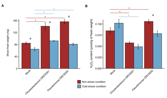 Functional effects of cold-tolerant bacterial isolates on tomato plants under non-stress and cold-stress conditions. Tomato plants were treated with MgSO4 (mock-inoculated) or inoculated with Chryseobacterium sp. GRCS301 or Pseudomonas sp. GRCS202. Plants were incubated in the growth chamber for 14 days at 25 ± 2 °C, two groups of plants were then obtained, and they were incubated at 25 ± 2 °C (non-stressed plants) or at 10 ± 2 °C (cold-stressed plants) for 14 days. Shoot fresh weight (A) and H2O2 content (B) were assessed at 14 days and one day after stress exposure (DAS), respectively. Mean and standard error values of three replicates (pool of seven plants) are reported for each inoculation condition, temperature regime, and time point. Asterisks indicate significant differences between bacterium-inoculated and mock-inoculated samples for each temperature regime, according to the Mann–Whitney test (p ≤ 0.05). Hashtags indicate significant differences between cold-stressed and non-stressed plants for each inoculation condition, according to the Mann–Whitney test (p ≤ 0.05).
