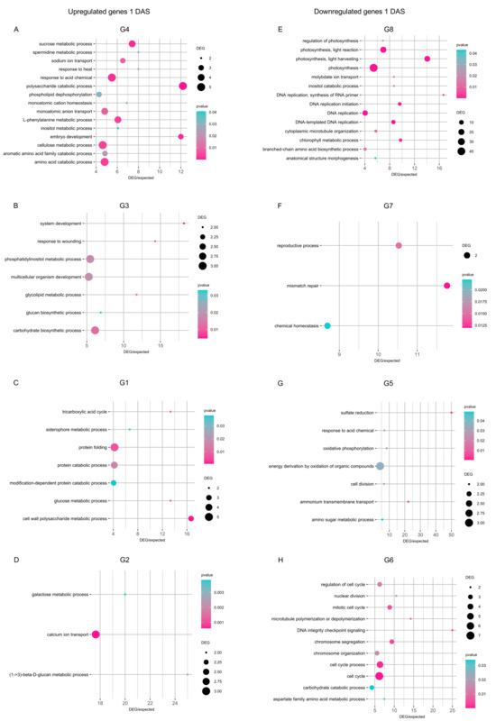 Enriched functional categories of genes modulated one day after stress exposure (DAS). Gene ontology (GO) enrichment analysis was carried out for genes upregulated (A–D) and downregulated (E–H) in the pairwise comparison between the cold-stressed and non-stressed samples in all inoculation conditions (A,E) or exclusively in mock-inoculated plants (B,F), Chryseobacterium-inoculated plants (C,G), or Pseudomonas-inoculated plants (D,H) at 1 DAS. The number of DEGs is reported according to the dimension scale, and the significance of Fisher’s test (p ≤ 0.05) is reported according to the color legend for each functional category, with a ratio between DEGs and expected genes higher than five. The group (G) numbers of DEGs are referred to Venn diagrams of Figure 4, such as genes modulated in cold-stressed samples (CS) compared to non-stressed samples (NS) in all inoculation conditions (G4, G8, G12, and G16) or exclusively in mock- (G3, G7, G11, and G15), Chryseobacterium- (G1, G5, G9, and G13), or Pseudomonas- (G2, G6, G10, and G14) inoculated plants were selected for further analyses.
