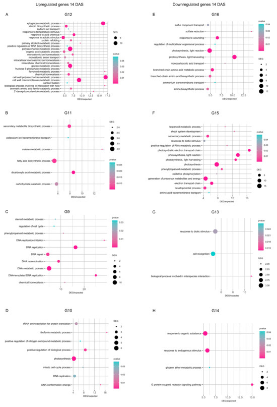 Enriched functional categories of genes modulated 14 days after stress exposure (DAS). Gene ontology (GO) enrichment analysis was carried out for genes upregulated (A–D) and downregulated (E–H) in the pairwise comparison between the cold-stressed and non-stressed samples in all inoculation conditions (A,E) or exclusively in mock-inoculated plants (B,F), Chryseobacterium-inoculated plants (C,G), or Pseudomonas-inoculated plants (D,H) at 14 DAS. The number of DEGs is reported according to the dimension scale, and the significance of Fisher’s test (p ≤ 0.05) is reported according to the color legend for each functional category, with a ratio between DEGs and expected genes higher than five. The group (G) numbers of DEGs are referred to Venn diagrams of Figure 4, such as genes modulated in cold-stressed samples (CS) compared to non-stressed samples (NS) in all inoculation conditions (G4, G8, G12, and G16) or exclusively in mock- (G3, G7, G11, and G15), Chryseobacterium- (G1, G5, G9, and G13), or Pseudomonas- (G2, G6, G10, and G14) inoculated plants were selected for further analyses.