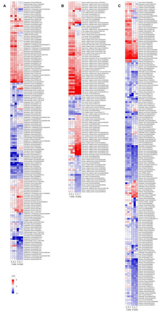 Heatmaps of differentially expressed genes (DEGs) modulated by cold stress and belonging to functional categories possibly involved in cold stress mitigation, such as oxidative stress (A), stress response (B), and hormonal signaling (C). Log2-transformed fold change values (color legend; LFC) of tomato DEGs are reported for each pairwise comparison between cold-stress (CS) and non-stress (NS) samples of mock-inoculated plants (columns a and d), Chryseobacterium-inoculated plants (columns b and e), and Pseudomonas-inoculated plants (columns c and f) collected at one day and 14 days after stress exposure (DAS). DEGs were assigned to functional categories according to protein descriptions (Table S4) and sorted according to hierarchical clustering on expression profiles. Abbreviations: LEA, late embryogenesis abundant.