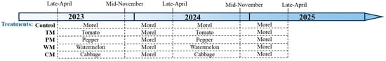 A cartoon of the timeline of the experimental process. Control, morel monoculture; TM, tomato–morel; PM, pepper–morel; WM, watermelon–morel; CM, cabbage–morel.