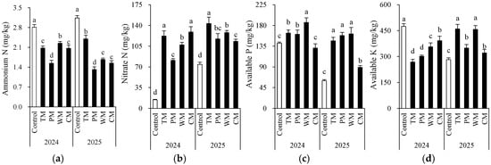 Each rotation treatment had a significant impact on soil fertility indicators (Figure 2 and Figure 3). When compared with the control, all rotation treatments demonstrated better performance in multiple soil chemical properties. Specifically, in 2024, the TM and CM treatments had significantly higher contents of available N (155.5 mg/kg and 147.4 mg/kg), nitrate N (122.0 mg/kg and 128.9 mg/kg), and organic matter (24.7 g/kg and 26.8 g/kg) than the control. The WM treatment had the highest available P content (186.4 mg/kg). In 2025, the TM, PM, and WM treatments still maintained high levels of available N, nitrate N, and available P. In particular, the TM treatment had 169.3 mg/kg of available N and 143.3 mg/kg of nitrate N, which were significantly higher than those of the control.