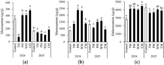 Morel root-zone soil glucosamine (a), mannosamine (b), and galactosamine (c) as affected by different treatments. The values are expressed as mean ± standard deviation. For the same year, different letters denote significant differences at the p < 0.05 level. Control, morel monoculture; TM, tomato–morel; PM, pepper–morel; WM, watermelon–morel; CM, cabbage–morel.