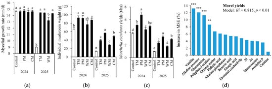 Mycelial growth rate (a), individual mushroom weight (b), and morel yields (c) as affected by different treatments and random forest modeling analysis revealing the importance of main predictors (% increase in MSE) for morel yields (d). The values are expressed as mean ± standard deviation. For the same year, different letters denote significant differences at the p < 0.05 level. Control, morel monoculture; TM, tomato–morel; PM, pepper–morel; WM, watermelon–morel; CM, cabbage–morel. R2 denotes the proportion of variance explained. ** and *** indicate p < 0.01 and p < 0.001, respectively.