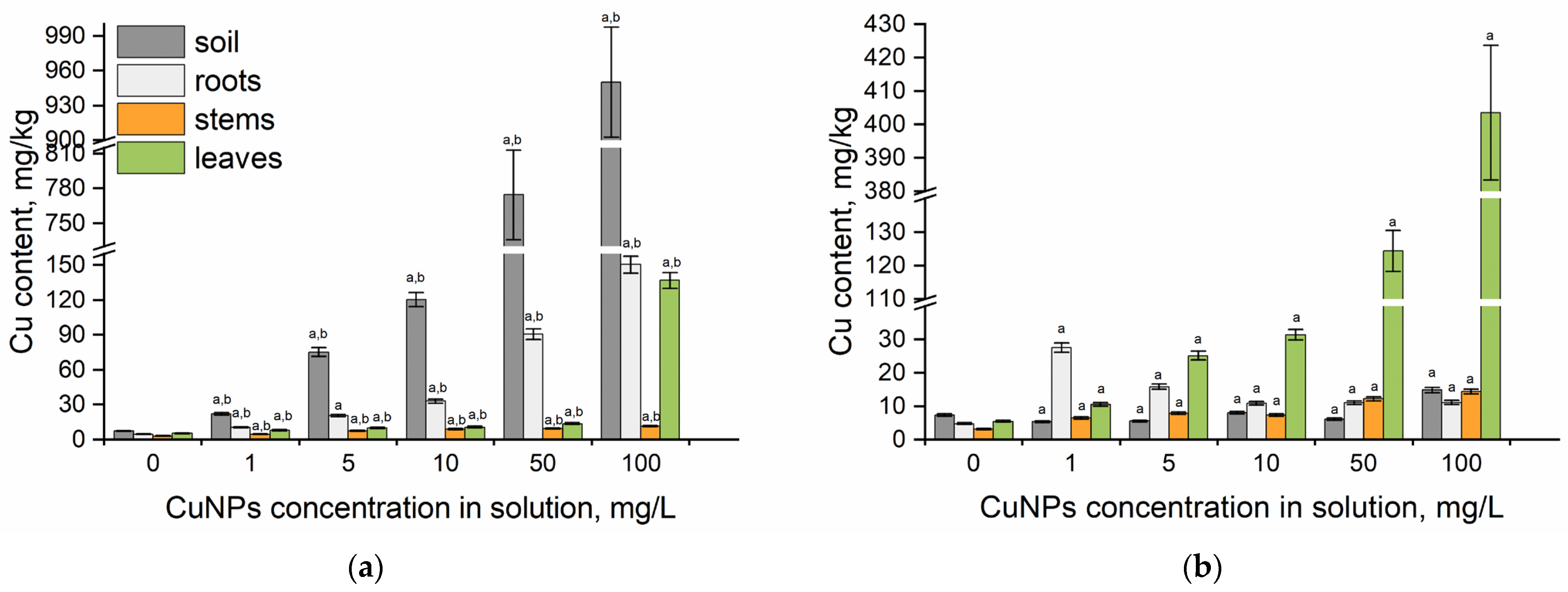 - Rajput, V.D.; Minkina, T.; Suskova, S.; Mandzhieva, S.; Tsitsuashvili, V.; Chapligin, V.; Fedorenko, A. Effects of Copper Nanoparticles (CuO NPs) on Crop Plants: A Mini Review. Bionanoscience 2018, 8, 36–42. [Google Scholar] [CrossRef]