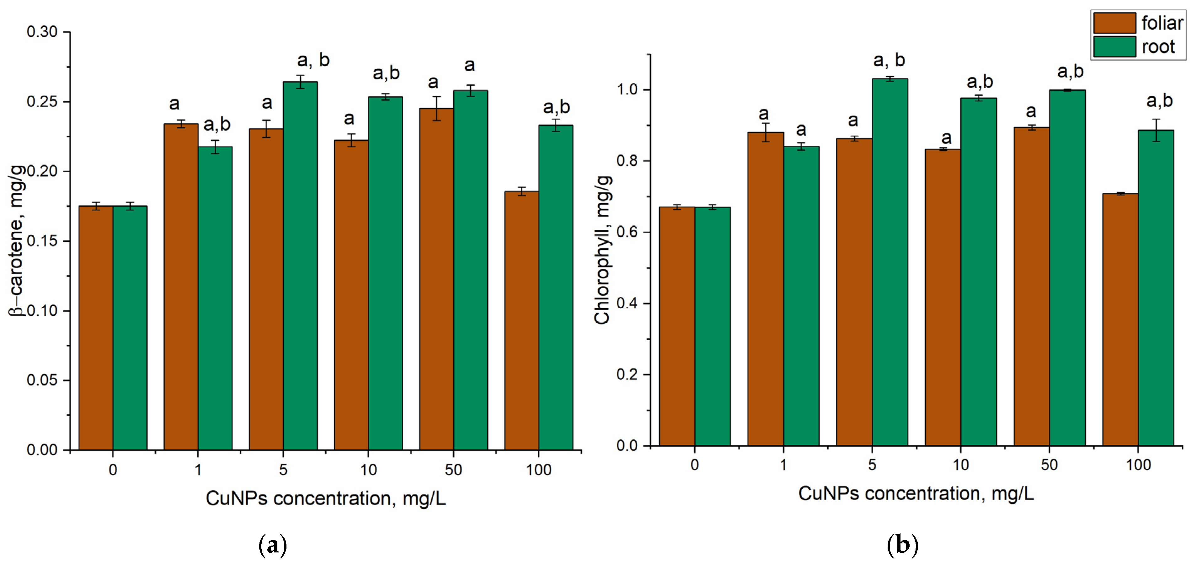 - Nekoukhou, M.; Fallah, S.; Pokhrel, L.R.; Abbasi-Surki, A.; Rostamnejadi, A. Foliar Enrichment of Copper Oxide Nanoparticles Promotes Biomass, Photosynthetic Pigments, and Commercially Valuable Secondary Metabolites and Essential Oils in Dragonhead (Dracocephalum moldavica L.) under Semi-Arid Conditions. Sci. Total Environ. 2023, 863, 160920. [Google Scholar] [CrossRef] [PubMed]