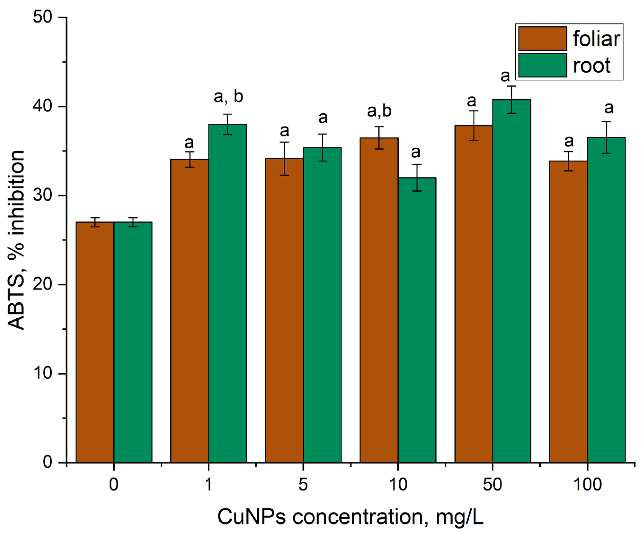 | Copper Content in Leaves Under Root Exposure, mg/kg | Extraction, % | Copper Content in Leaves Under Foliar Spraying Condition, mg/kg | Extraction, % | |