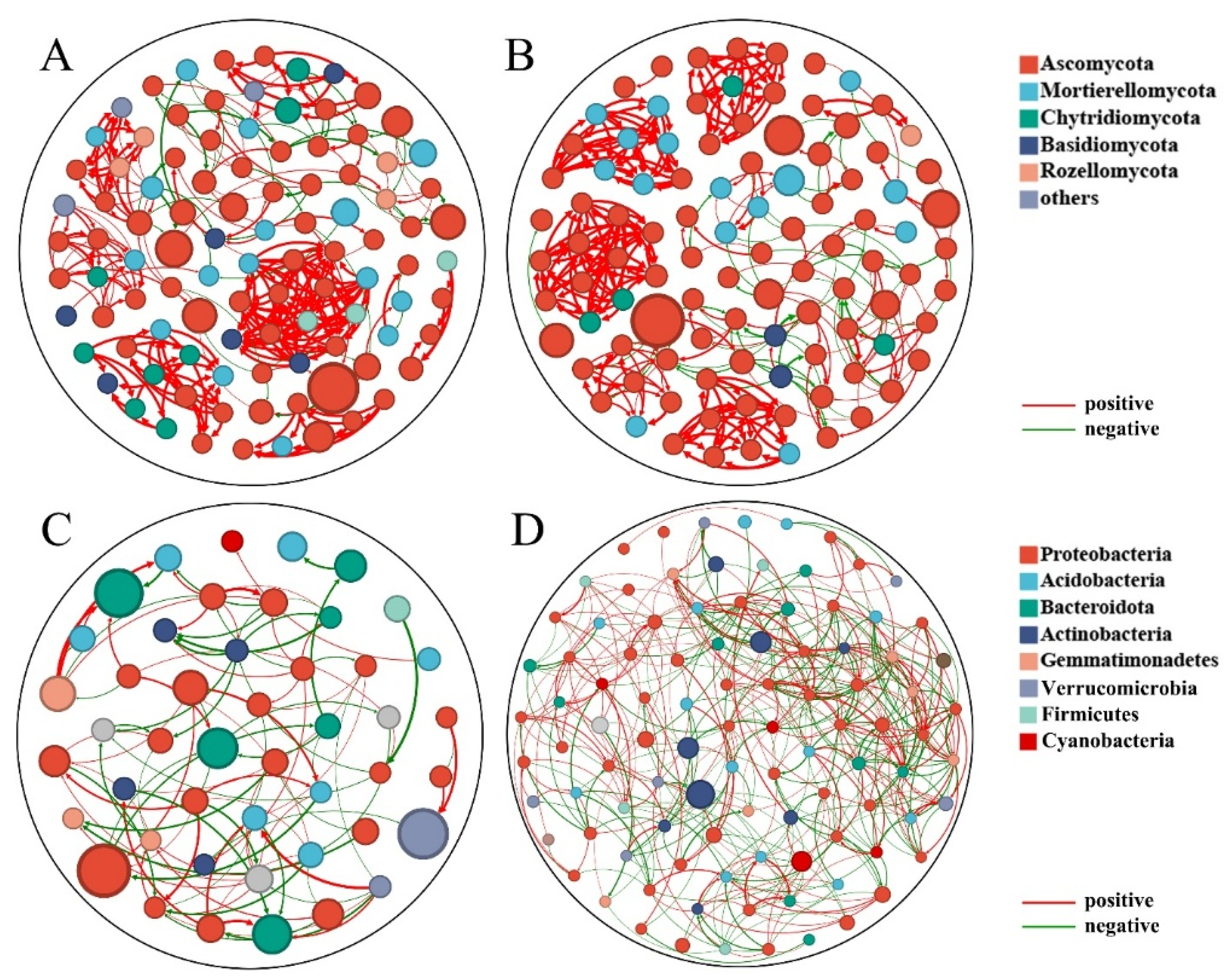 Figure 4. Co-occurrence network analysis of fungal and bacterial communities. (A) Diseased fungal network. (B) Healthy fungal network. (C) Diseased bacterial network. (D) Healthy bacterial network. Node size represents relative abundance. Lines represent significant Spearman correlations (positive or negative).