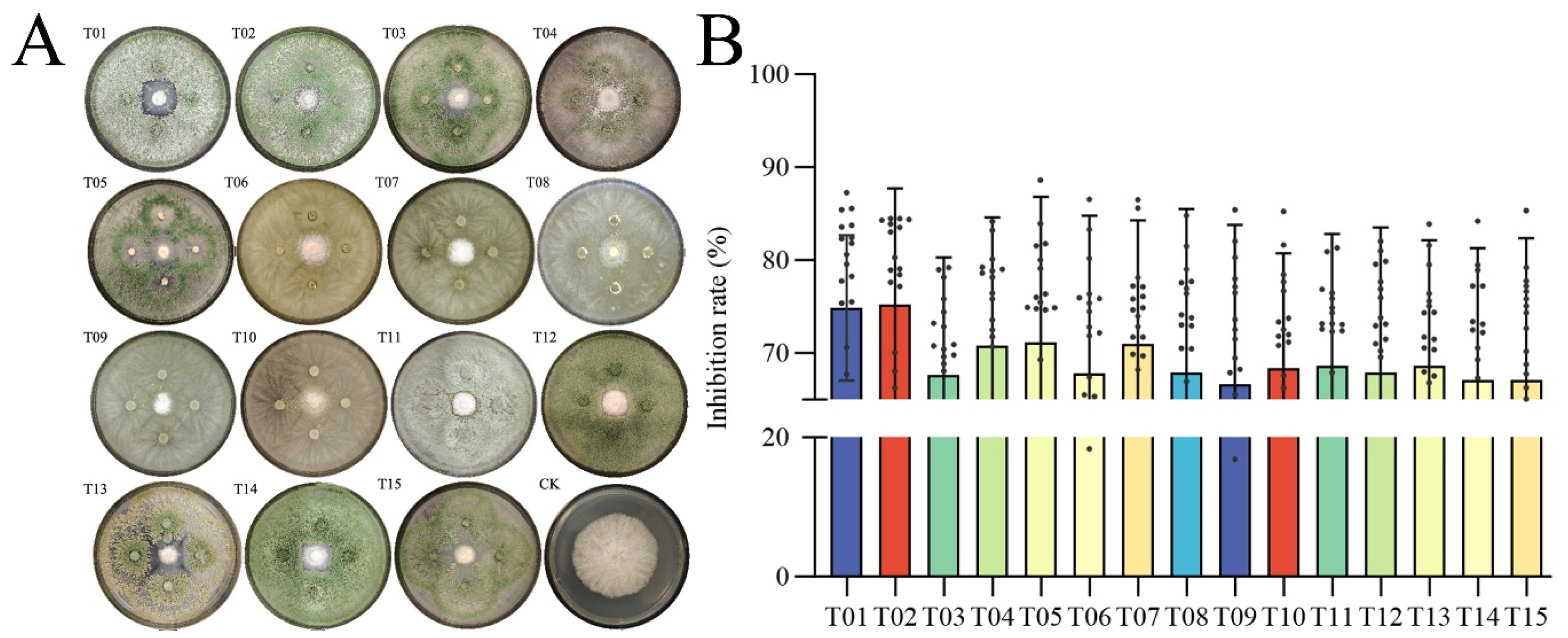 Figure 5. Fusarium abundance and antagonism. (A) Images of the inhibition of Fusarium by Trichoderma groups after 72 h of co-culture. (B) Inhibition rate of the 15 Trichoderma groups against 18 Fusarium groups. In plot (B), bars represent the mean inhibition rate for each Trichoderma group against all tested Fusarium groups, error bars indicate the standard deviation, and individual points show the inhibition rate against each of the 18 Fusarium isolates.