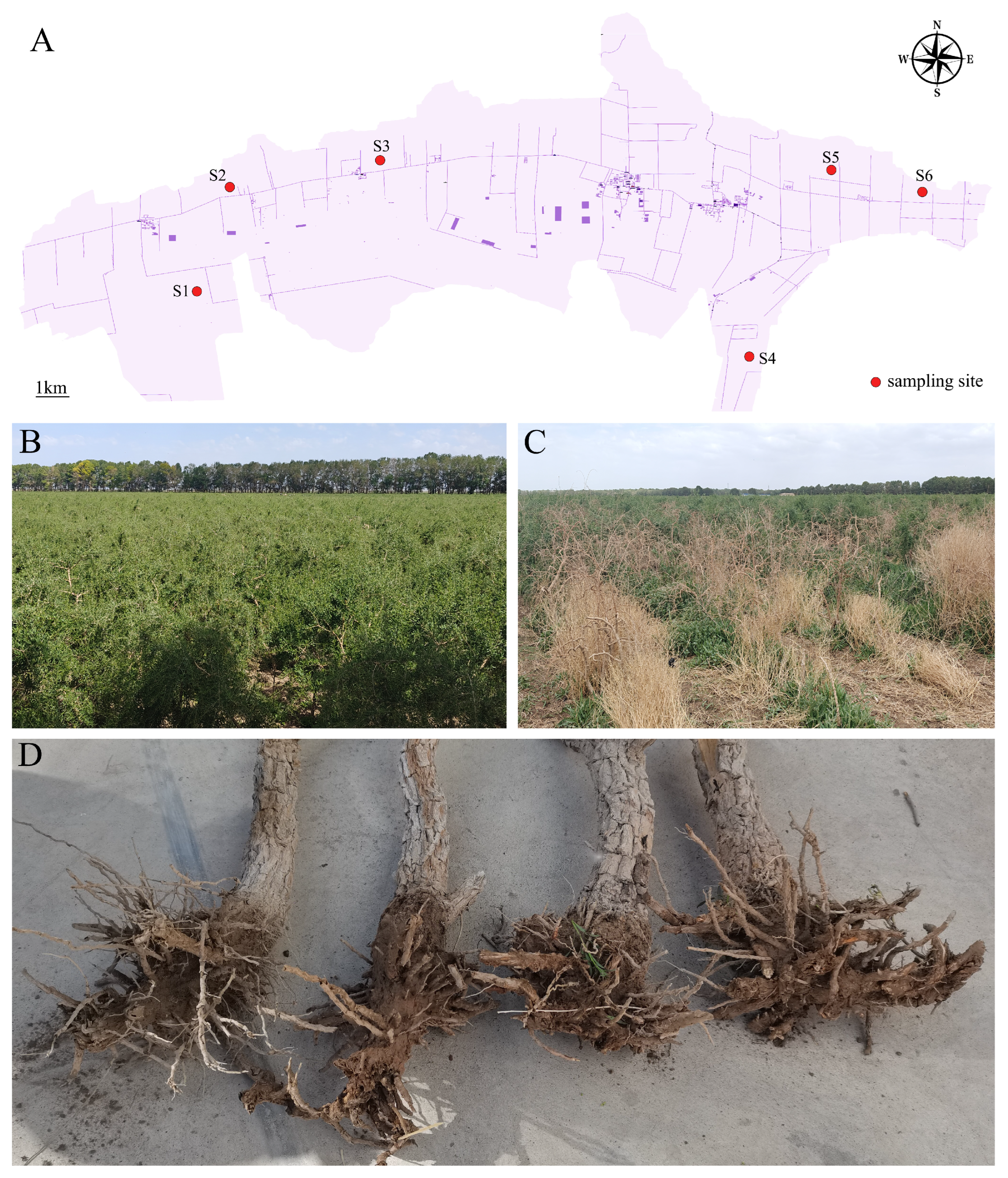 Soil samples were collected in July 2023 from the Nomuhong Farm (36°26′21.67″ N, 96°25′55.42″ E) located in Dulan County, Qinghai Province (Figure 6A). The sampling site is at an approximate altitude of 2800 m above sea level. It is situated within the Qaidam Basin, a core production area for L. barbarum in China. The region is characterized by a hyper-arid climate with an average annual precipitation of approximately 15 mm and features typical sandy soil. Six healthy plants, showing no visible symptoms of disease (Figure 6B), and six plants exhibiting typical root rot symptoms (e.g., yellowing leaves, root decay; Figure 6C) were randomly selected for sampling. For each plant, bulk soil was first removed from the root system. The roots were then shaken to dislodge loosely attached soil, and the remaining tightly adhering soil, defined as the rhizosphere soil, was collected using a sterile brush [41]. Each plant was treated as an independent biological replicate. The collected soil samples were immediately placed on dry ice for transport and subsequently stored in a −80 °C ultra-low-temperature freezer until further processing.