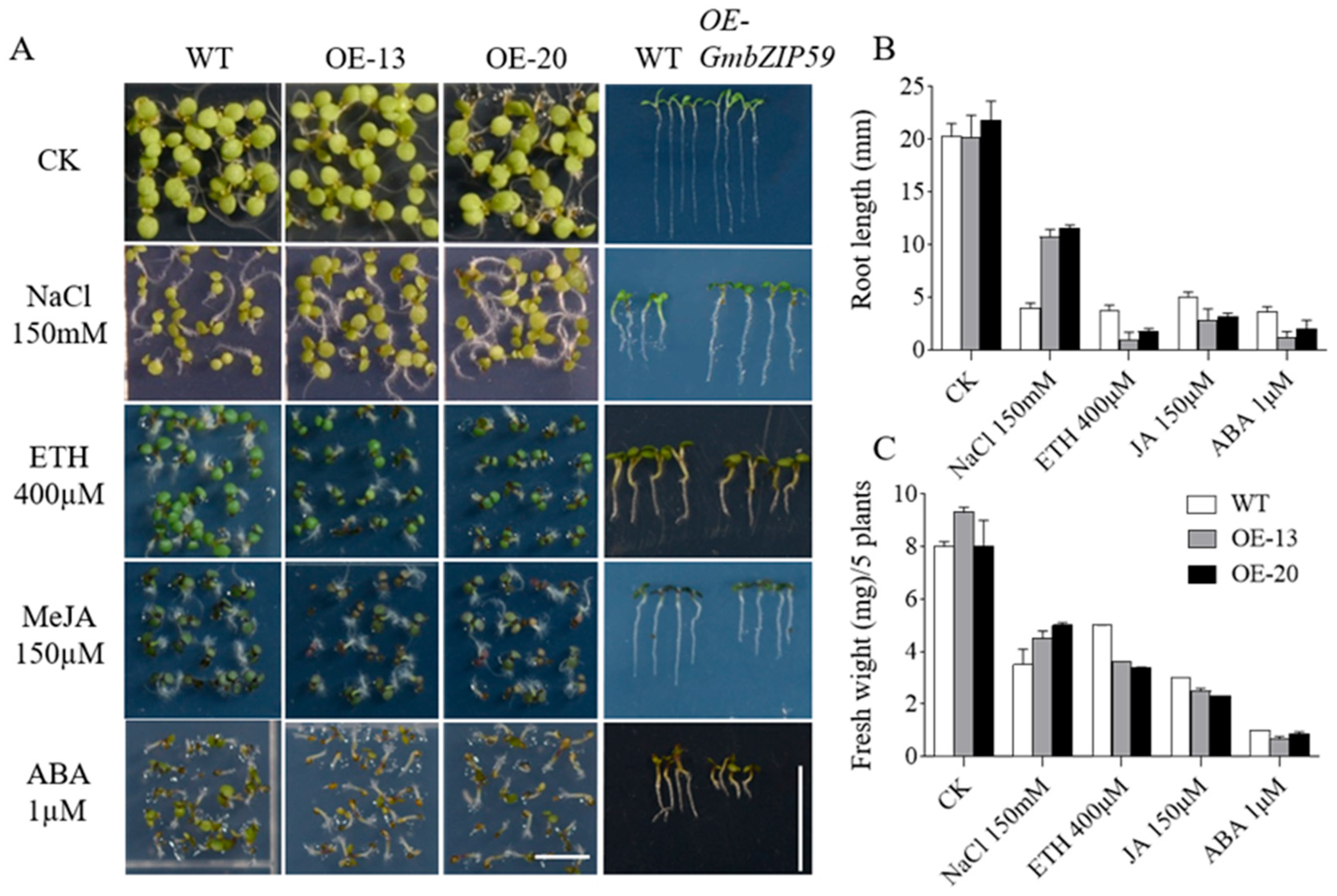 2.4. Ectopic Expression of GmbZIP59 Confers Salt Stress Tolerance but Enhances Phytohormone Sensitivity in Arabidopsis