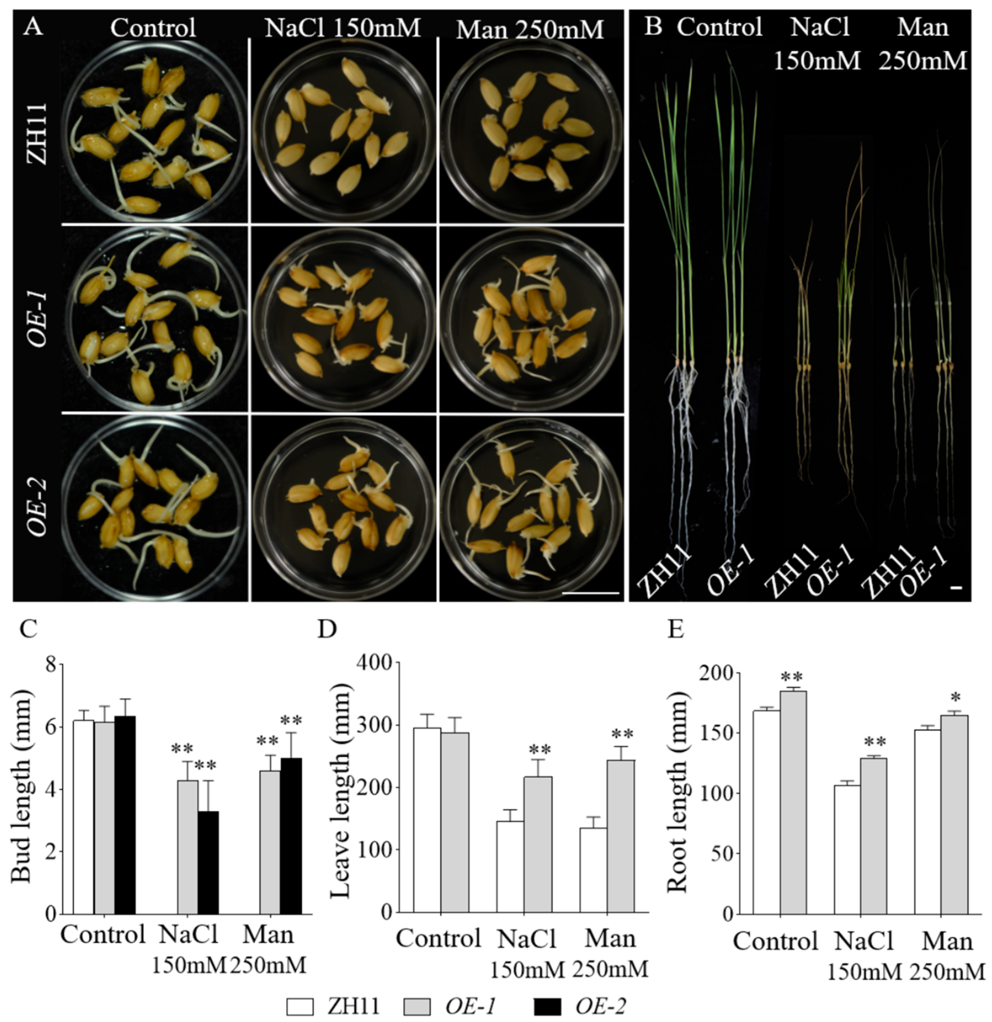 - Liu, C.; Mao, B.; Ou, S.; Wang, W.; Liu, L.; Wu, Y.; Chu, C.; Wang, X. OsbZIP71, a bZIP transcription factor, confers salinity and drought tolerance in rice. Plant Mol. Biol. 2014, 84, 19–36. [Google Scholar] [CrossRef]
