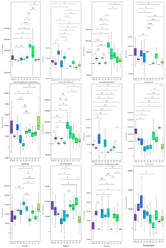 Advanced significance box plot of 12 flavonoid metabolites in F. suspensa. Asterisks indicated significant differences according to Student’s t-test (*, p < 0.05; **, p < 0.01; ***, p < 0.001; ****, p < 0.0001).