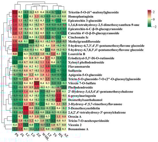 Cluster heatmap of flavonoid metabolites in F. suspensa. Colour depth represents the average intensity of metabolite contents. Red represents the highest content, green represents the lowest content.