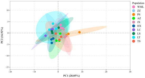 PCA further confirmed distinct metabolic differentiation among F. suspensa populations (Figure 3). The first two principal components, Principal Component 1 (PC1, 28.05%) and 2 (PC2, 16.92%), collectively explained 44.97% of the total metabolic variance among samples. The score plot showed clear separation among all populations, reflecting substantial inter-population metabolic diversity. Population clustering within the PCA ordination demonstrated metabolic similarity: PS and JX formed a close group, indicating similar flavonoid profiles; TS, HX, and AZ clustered together; and LC, LS, ZZ, WML, and LT comprised a third cluster. These patterns were consistent with the hierarchical clustering results (Figure 2), confirming robust population-level differentiation in flavonoid composition across the studied F. suspensa populations.