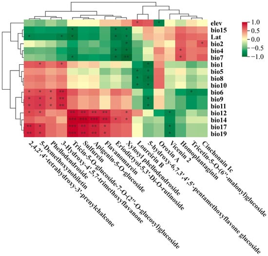 Cluster heatmap based on correlation between flavonoid metabolites and the environmental variables. Red represents positive correlation, green represents negative correlation. Asterisks indicated statistical significant (*, p < 0.05; **, p < 0.01; ***, p < 0.001).