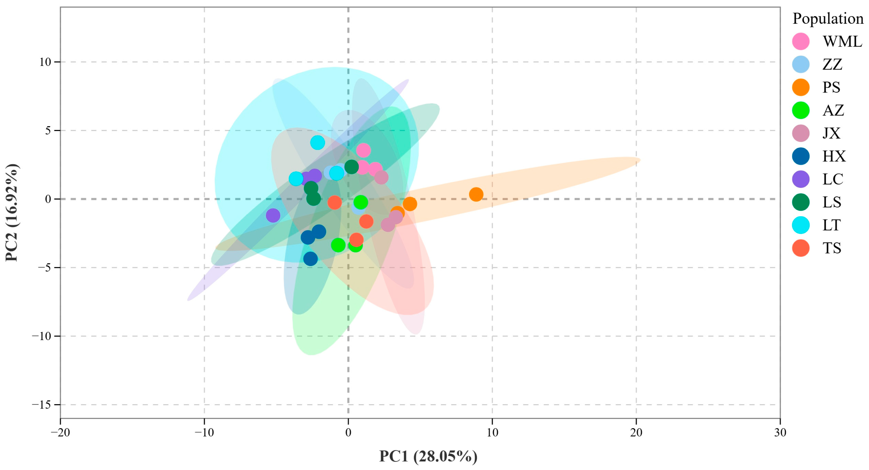 Chicago/Turabian StyleZhou, Shanshan, Longni Wu, Yahui Zhang, Yutong Guo, Jialan Xi, Danyang Li, and Jinlan Ji. 2025. "Variations in Flavonoid Metabolites Among Forsythia suspensa Populations in Response to Environmental Heterogeneity" Plants 14, no. 21: 3329. https://doi.org/10.3390/plants14213329