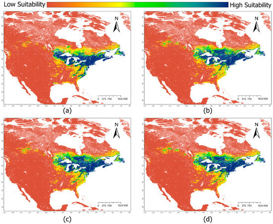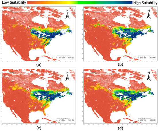 Suitable habitat of Sarracenia purpurea in North America for (a) the baseline climate scenario (climate normal period from 1970 to 2000) and three climate change scenarios projected to the year 2040: (b) Shared Socioeconomic Pathway (SSP) 1–2.6, (c) SSP 3–7.0, (d) SSP 5–8.5. Colors indicate habitat suitability.