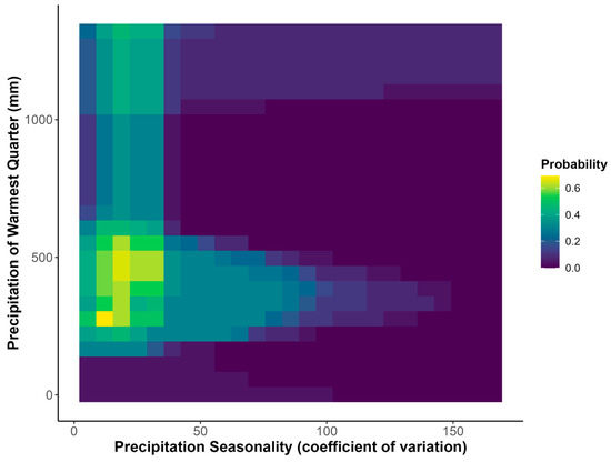 Bivariate response curve for precipitation seasonality (coefficient of variation) and precipitation of the warmest quarter of the year. Colors indicate the probability of suitable habitat occurring in response to each of the predictor variables.
